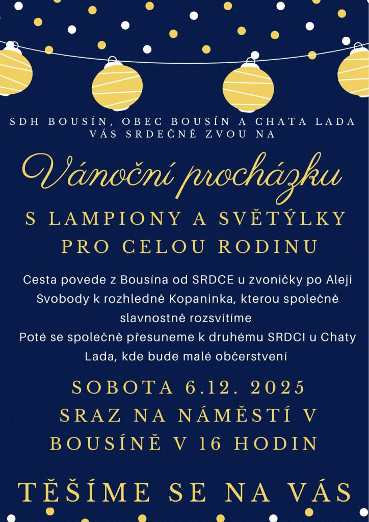 V sobotu 06.12.2025 se uskuteční předvánoční procházka s lampionky, na kterou jste srdečně zváni. Sraz je u zvoničky v Bousíně v 16:00, odkud se vydáme alejí svobody směřující k rozhledně, kterou rozsvítíme. Po této části cesty se přesuneme k chatě Lada k srdci, kde si můžete vychutnat teplý punč nebo svařák. Přijďte si užít kouzlo předvánoční atmosféry v naších obcích.