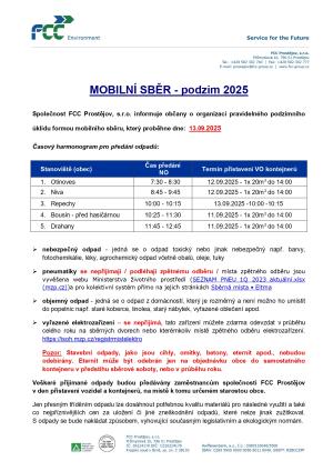 Společnost FCC Prostějov informuje o mobilním sběru odpadu, který proběhne 10. května 2025. Občané mohou odevzdat nebezpečné, objemné odpady a další materiály. Podrobnosti a harmonogram jsou uvedeny v oznámení.
